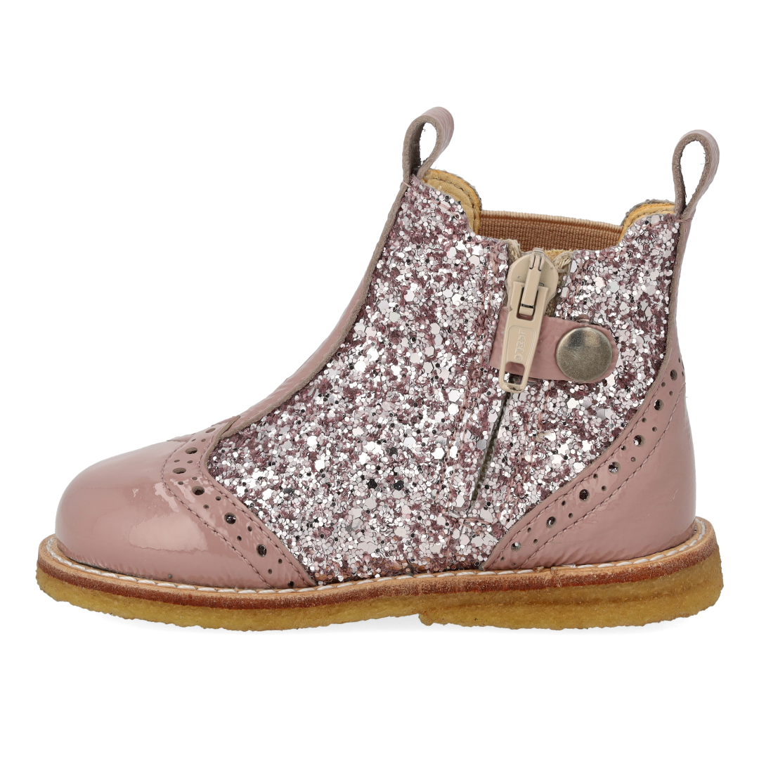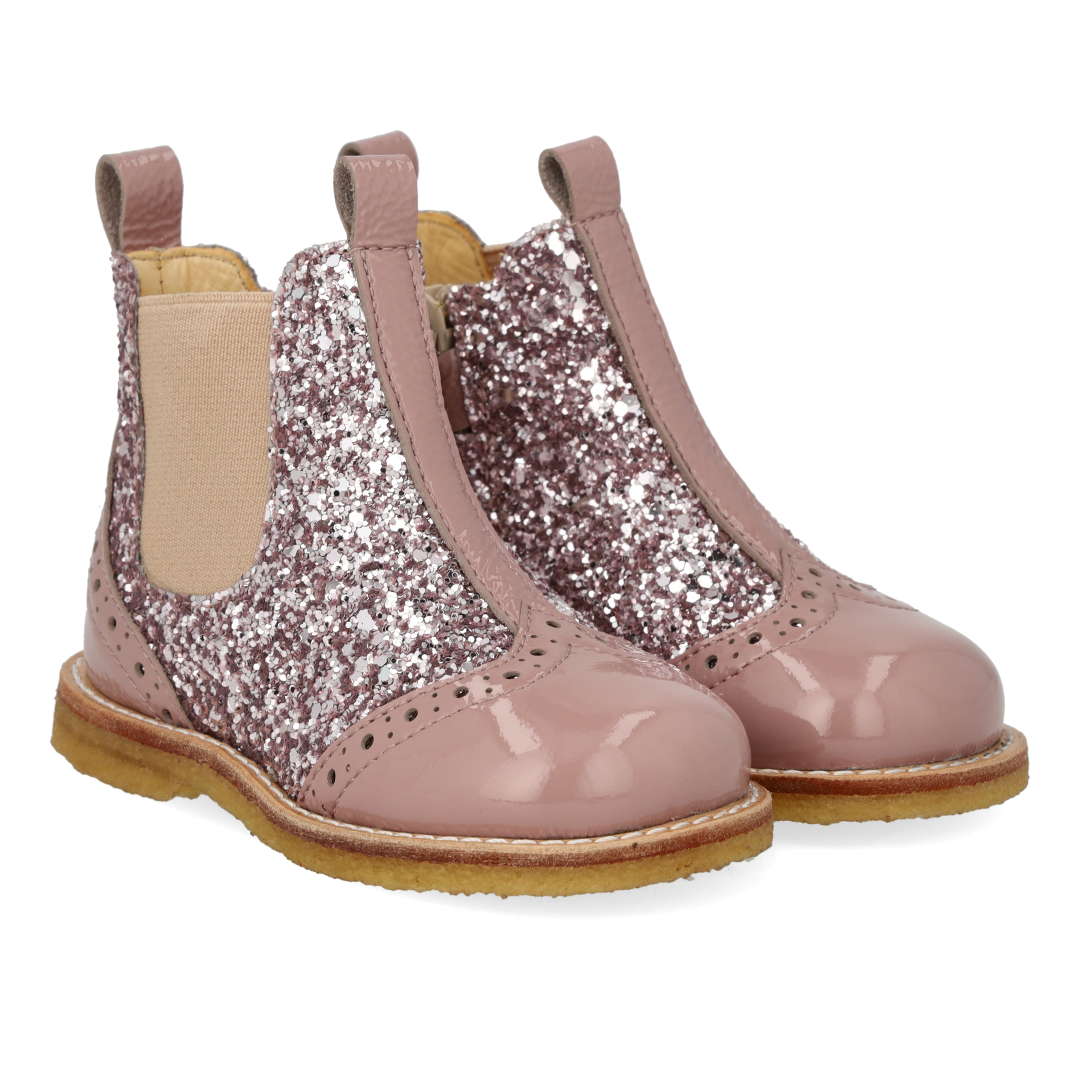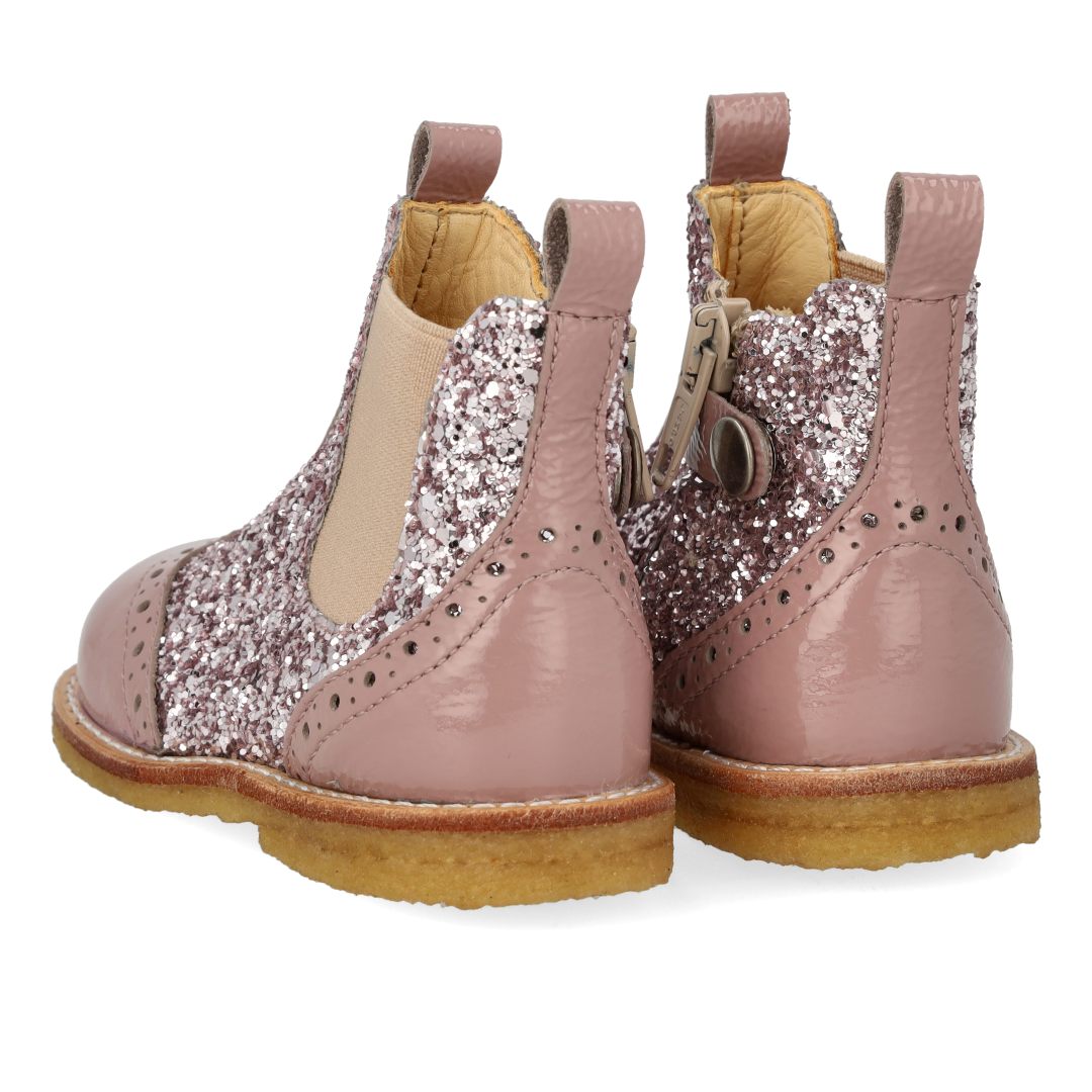 Classic Chelsea boot with sparkling glitter and decorative brogue pattern. The boot features an elasticated strap on one side and a zip and press stud on the other and a light, soft and flexible crepe rubber sole in renewable natural rubber cut focusing on arch support. The shoe features a fixed heel counter, padded insole and chrome-free leather lining. Crafted in natural and breathable leather. Designed in Denmark and handmade with love in Portugal. Always measure your child's foot before buying to ensure you get the right size. We recommend a growth allowance of 1 cm.
