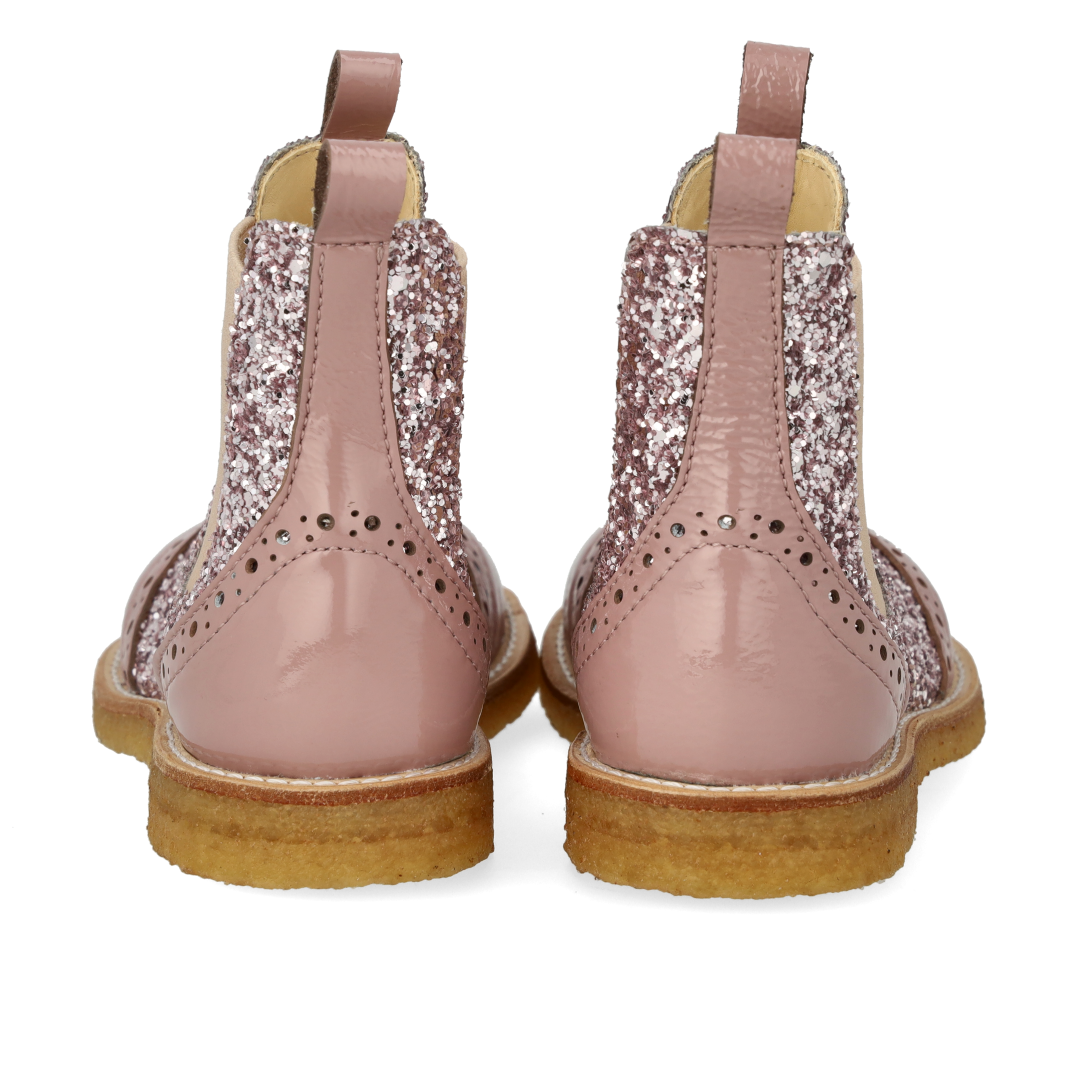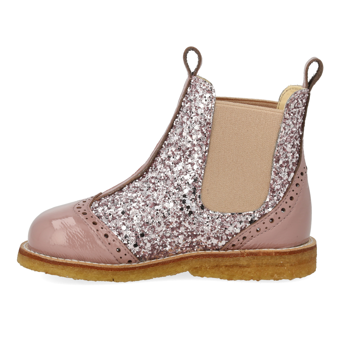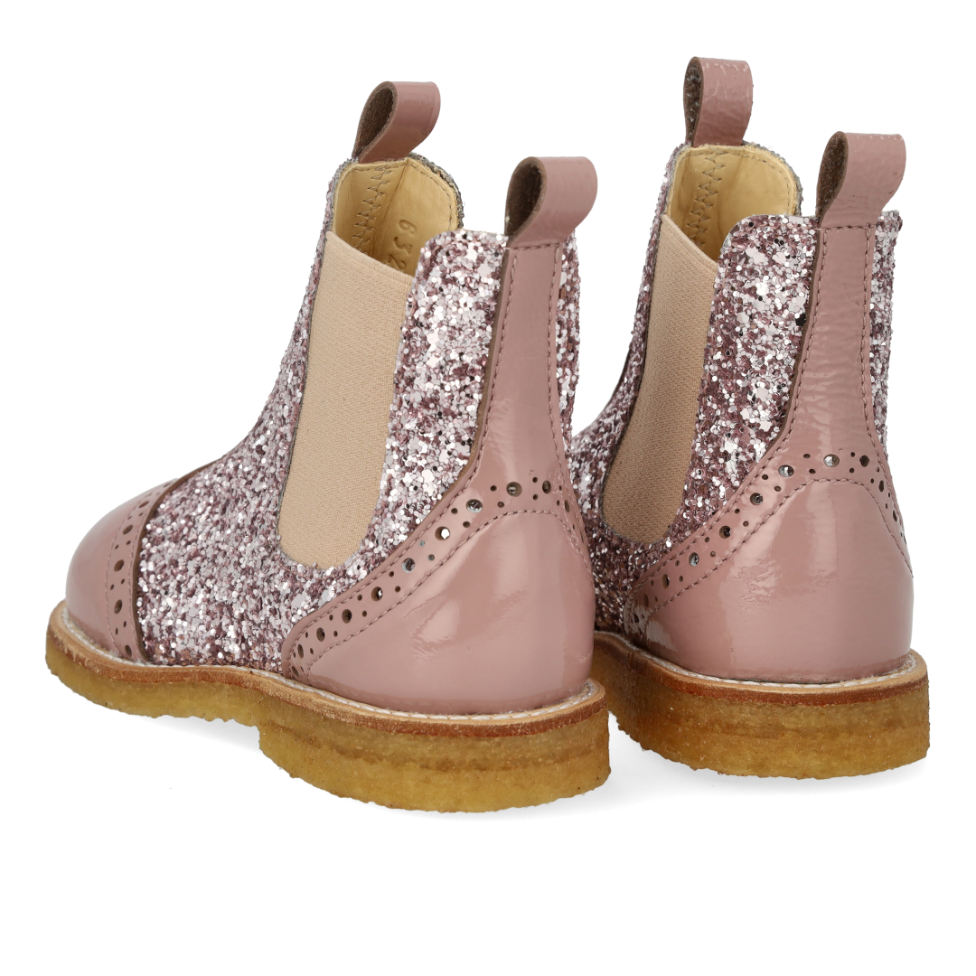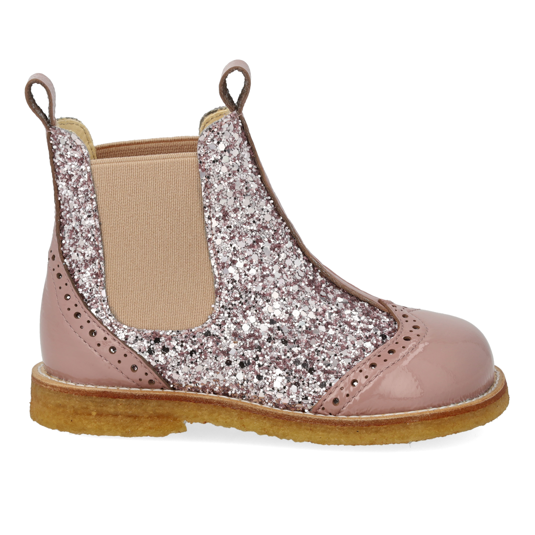 Classic Chelsea boot with decorative brogue lace pattern. The boot features functional elasticated sides and a light, soft and flexible crepe rubber sole in renewable natural rubber carved for extra arch support. The shoe has a padded insole, chrome-free leather lining and a fixed heel cap for extra comfort and support. Crafted in natural and breathable leather with canvas-based glitter. Designed in Denmark and handmade with love in Portugal. Always measure your child's foot before buying to ensure you get the right size. We recommend a growth allowance of 1-1.2 cm.