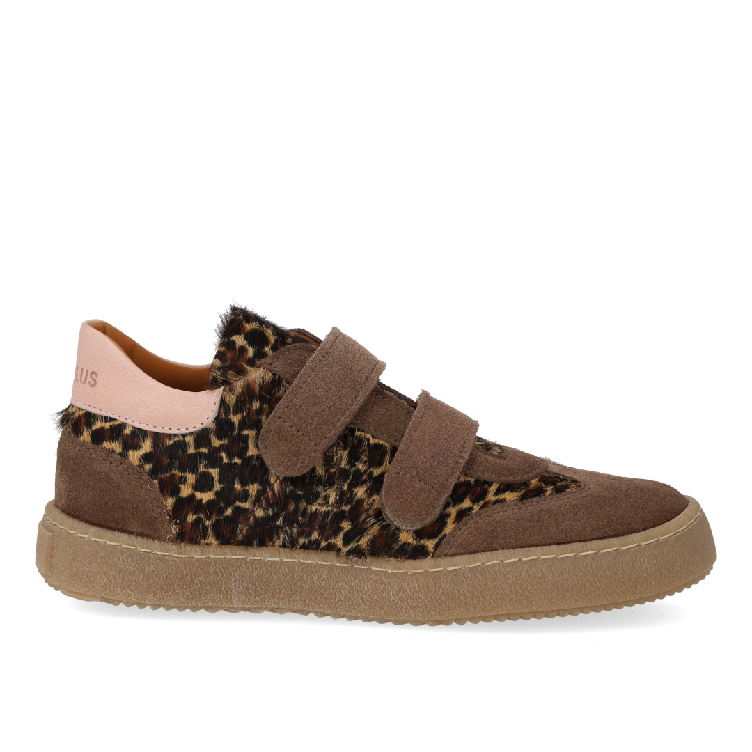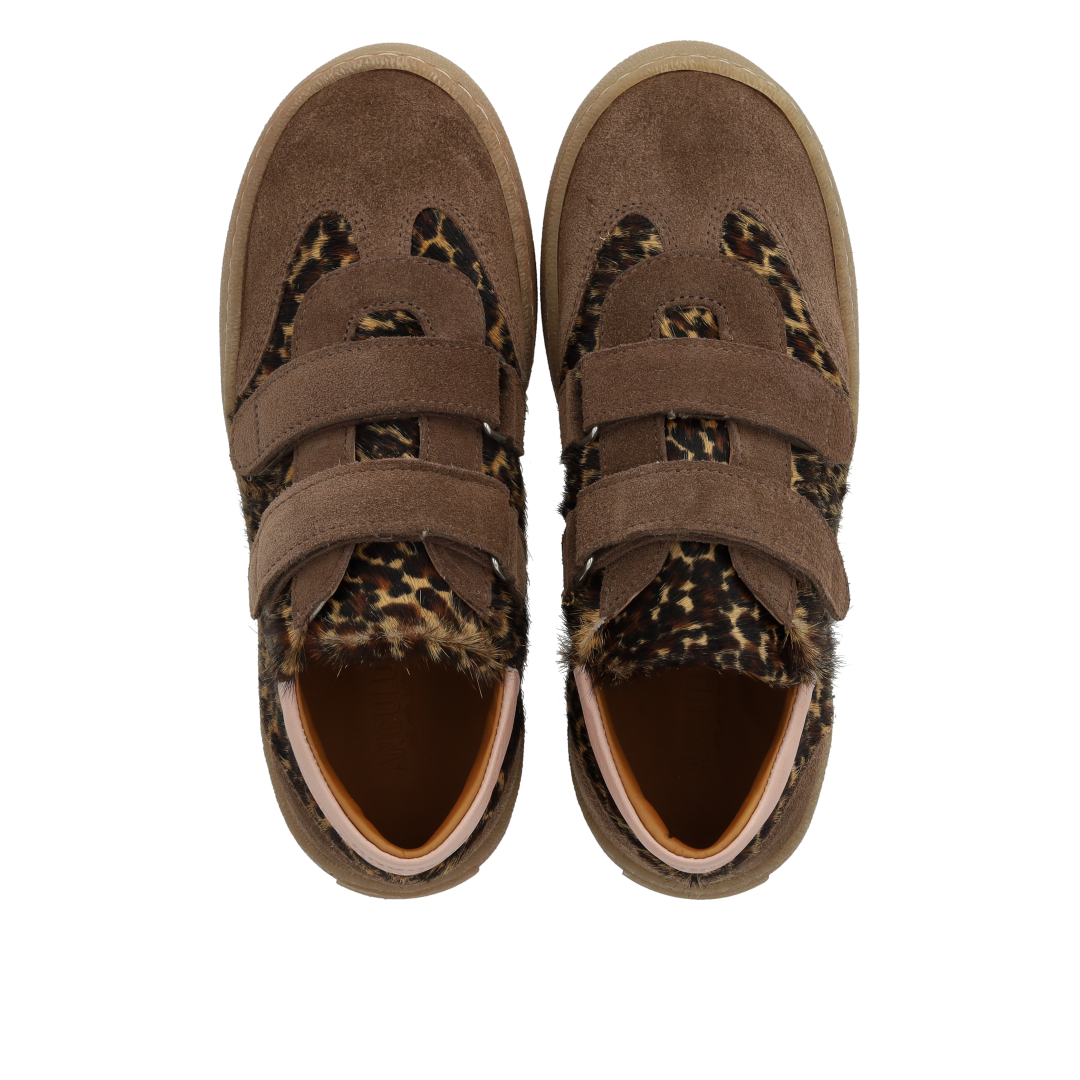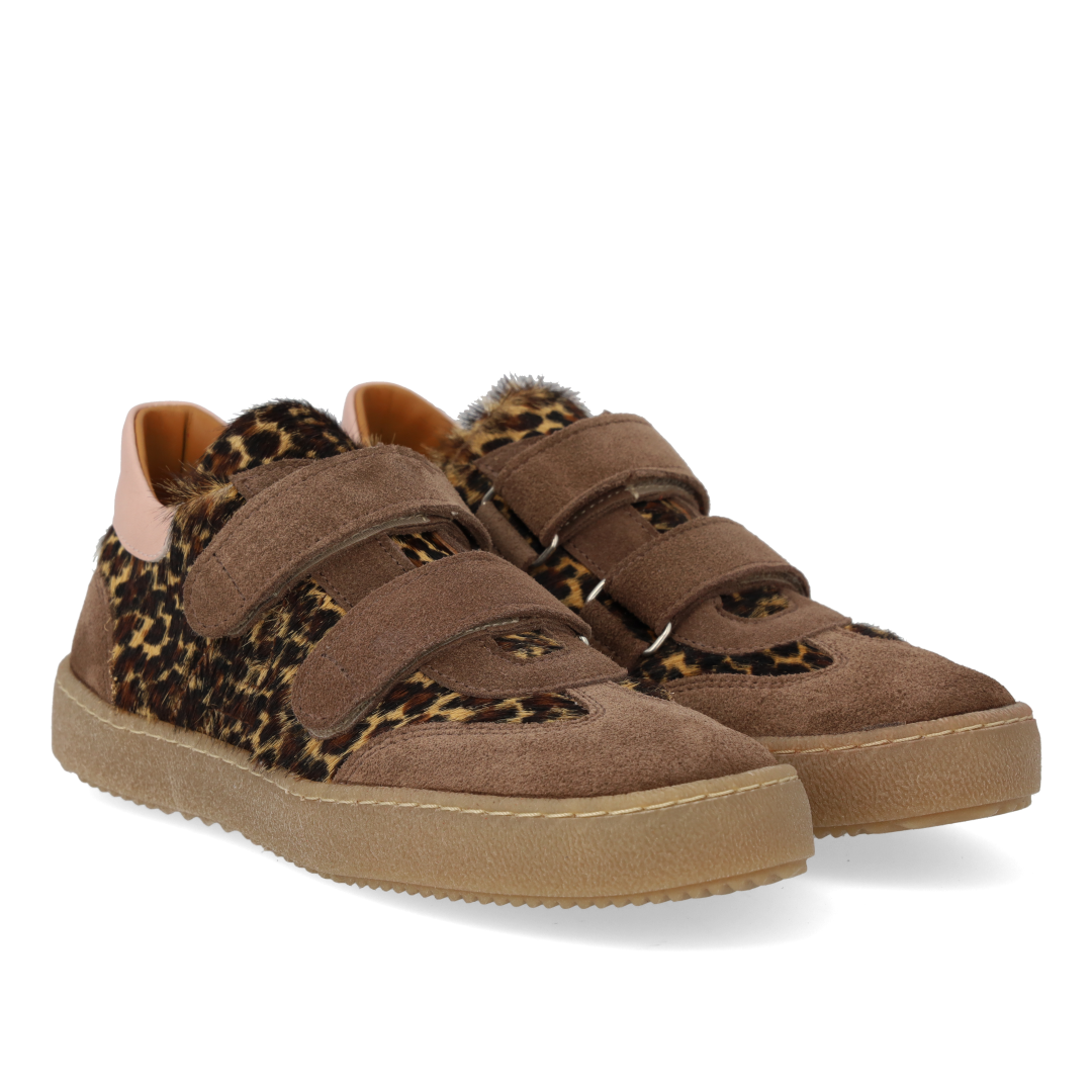 Sporty court style sneaker in leather and suede with leopard print pony fur. The sneaker features adjustable velcro straps for an optimal personalised fit that also makes it easy to get on and off, a fixed heel counter with padded contrast collar for extra stability and comfort, padded insole, chrome-free leather lining and a light, soft and flexible anti-slip rubber sole. Crafted in natural and breathable leather. Designed in Denmark and handcrafted with love in Portugal. Always measure the child's foot before buying to ensure you get the right size. We recommend a growth allowance of 0.8 cm.
