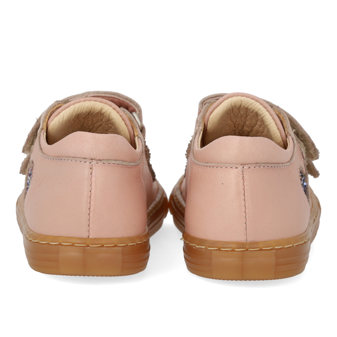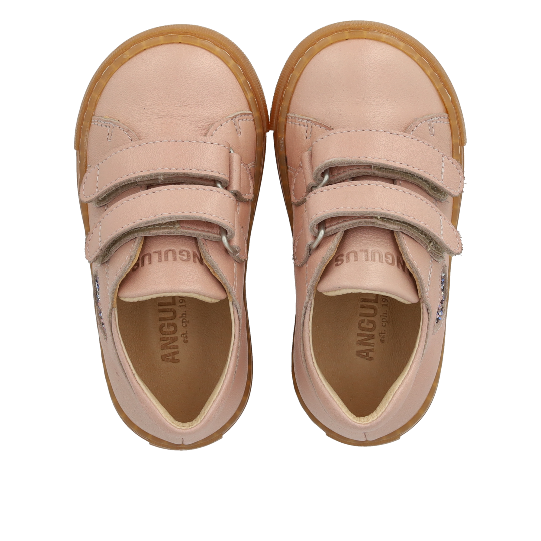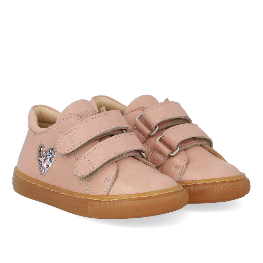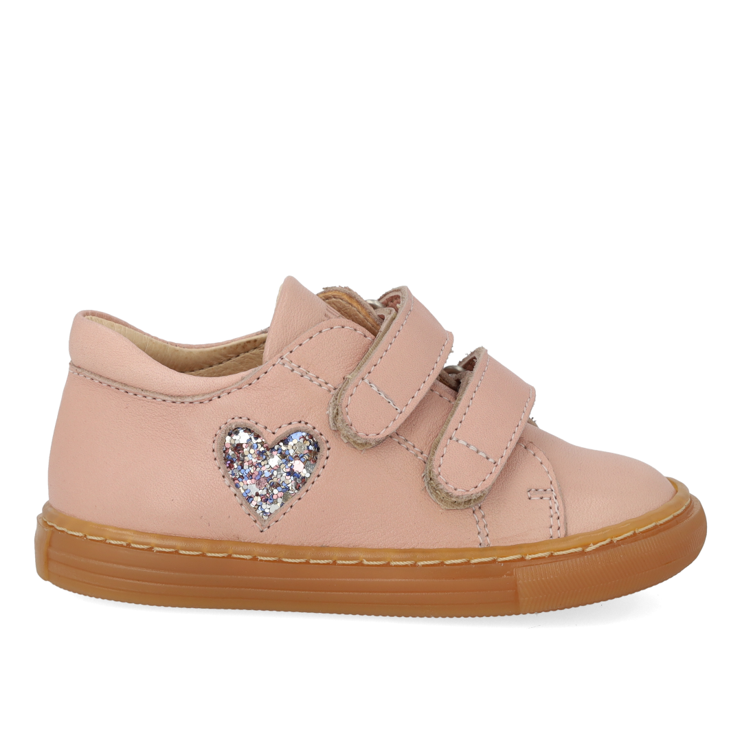 Classic beginner sneaker in leather with a sparkling glitter heart. The sneaker features adjustable velcro straps, embossed logo on the tongue, fixed heel cap with padded collar for extra comfort, stability and support, padded insole, chrome-free leather lining and a light, soft and flexible rubber sole. Crafted in natural and breathable leather. Designed in Denmark and handcrafted with love in Portugal. Always measure the child's foot before buying to ensure you get the right size. We recommend a growth allowance of 1 cm.