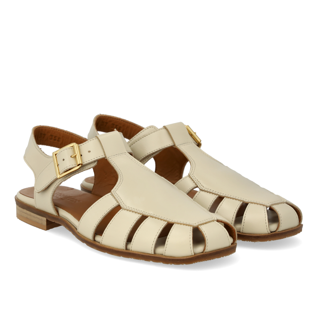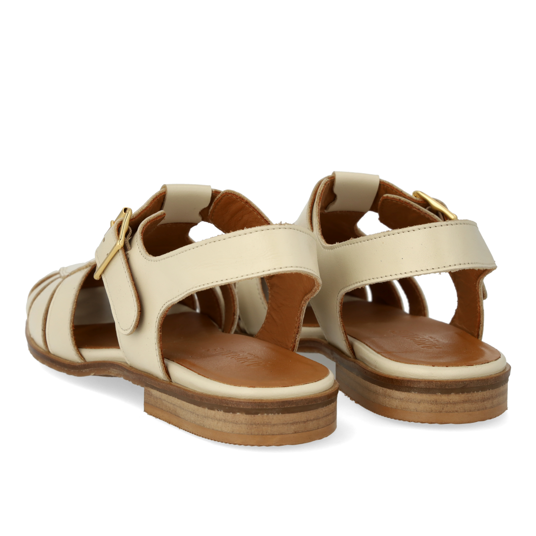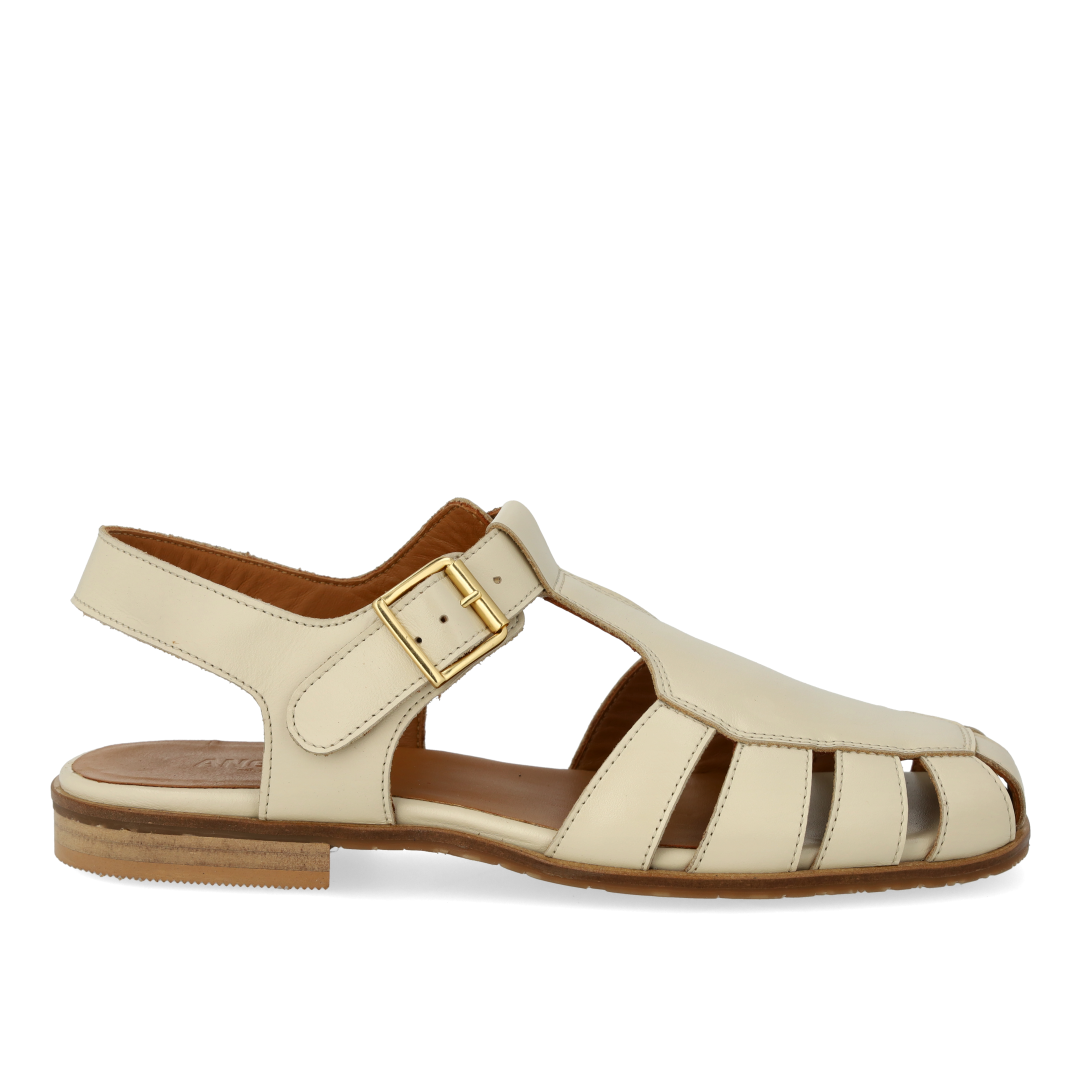 Classic leather fisherman's sandal with decorative hole pattern. The sandal features a moderately square toe, open heel, adjustable ankle strap with gold buckle, padded insole, chrome-free leather lining and logo sole in soft, flexible rubber. Made from natural, breathable leather. Designed in Denmark and lovingly handmade in Portugal.