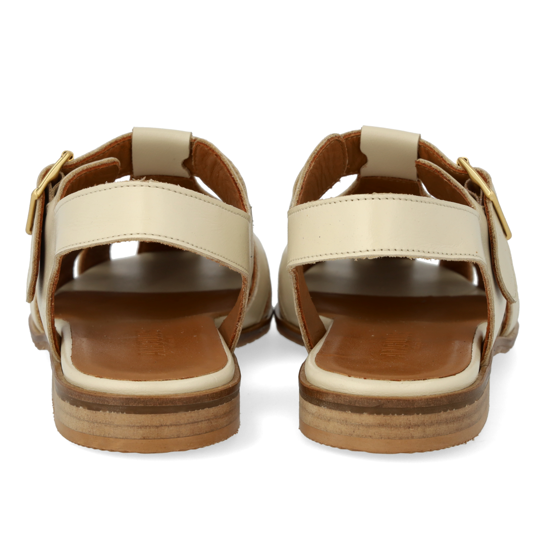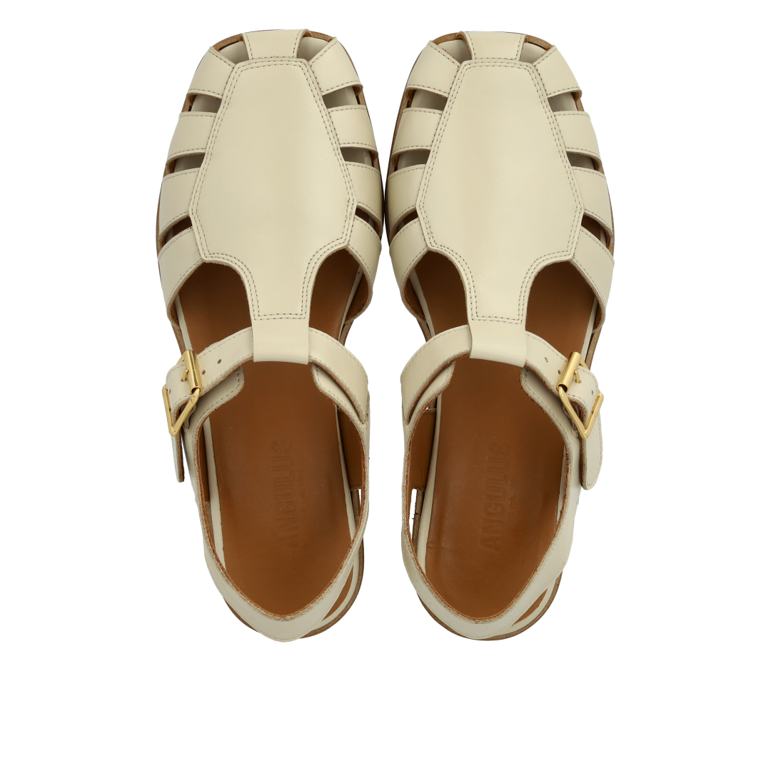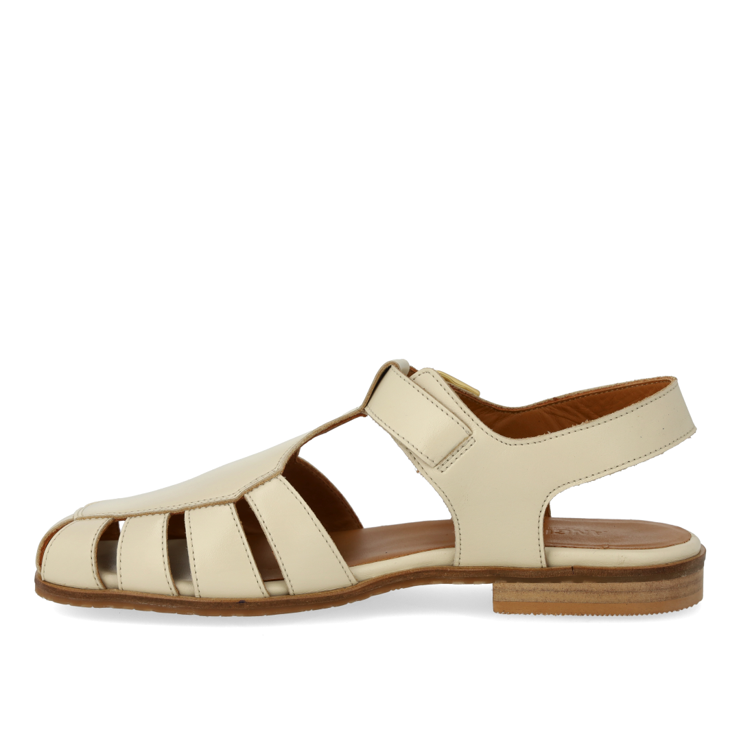 Classic leather fisherman's sandal with decorative hole pattern. The sandal features a moderately square toe, open heel, adjustable ankle strap with gold buckle, padded insole, chrome-free leather lining and logo sole in soft, flexible rubber. Made from natural, breathable leather. Designed in Denmark and lovingly handmade in Portugal.