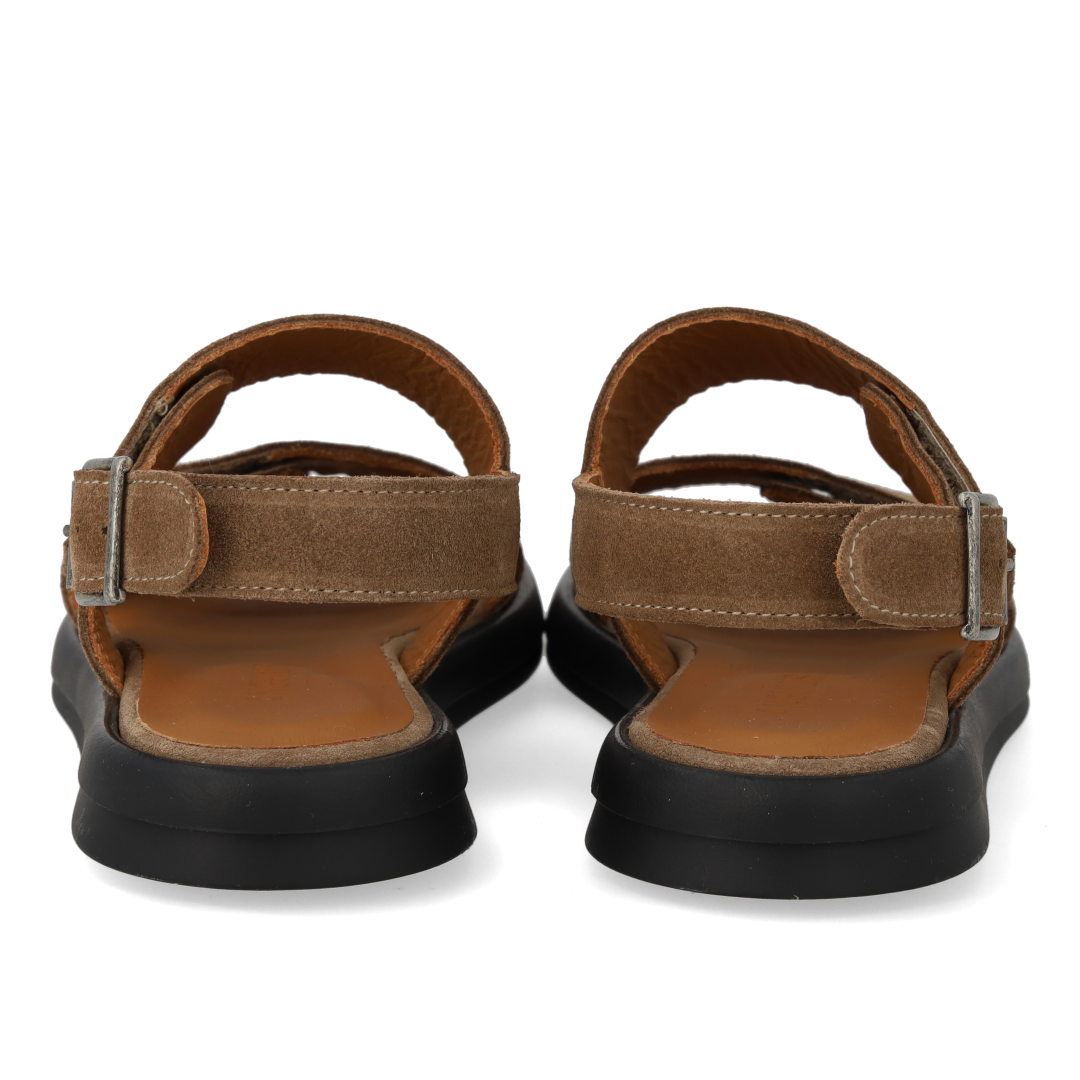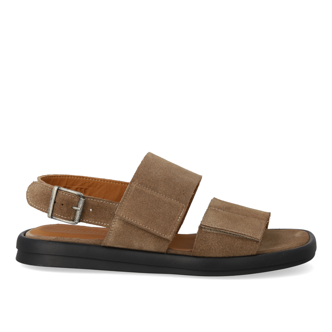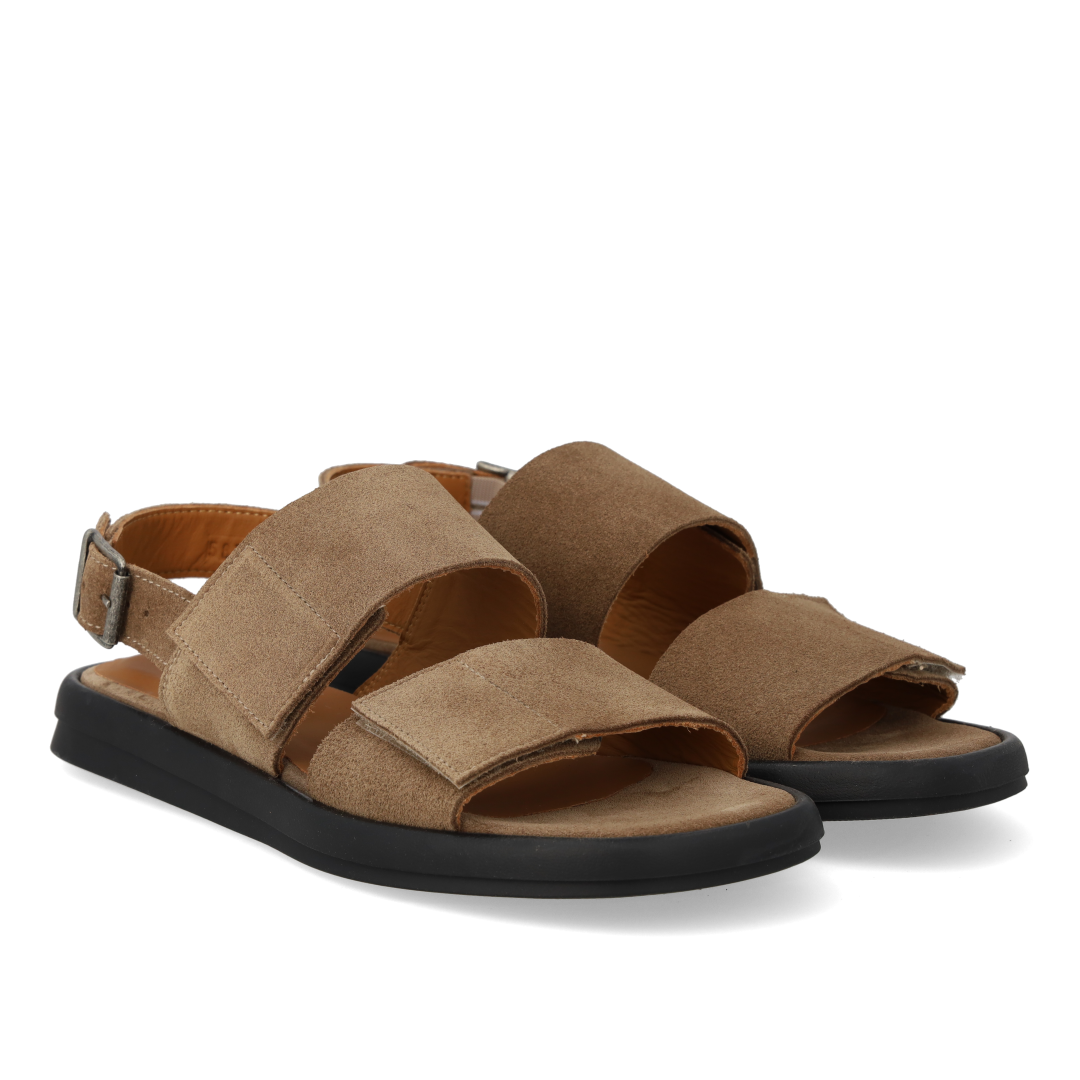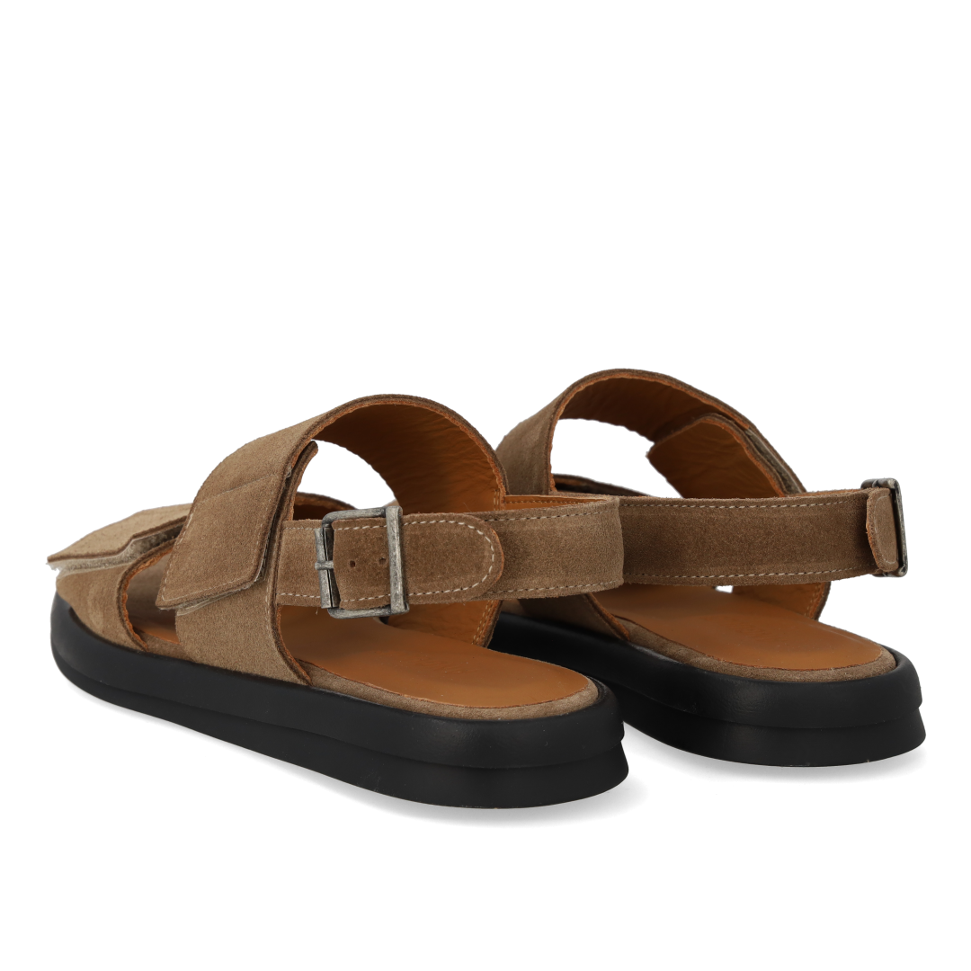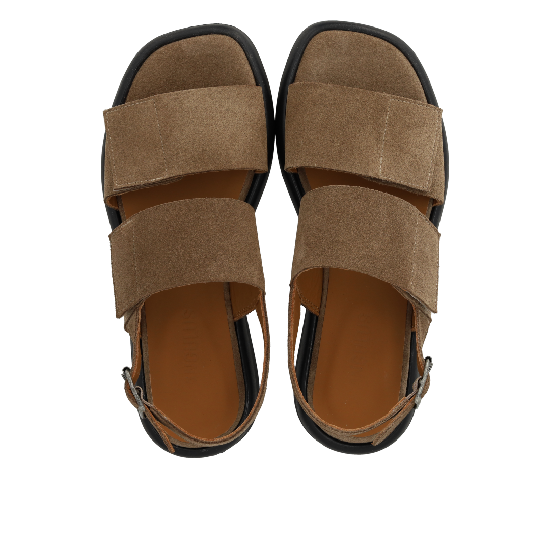 Minimalistic leather sandal with adjustable velcro strap. The sandal features a round toe, padded insole and lining in chrome-free leather, adjustable ankle strap with buckle closure and a light and flexible black rubber sole. Crafted in natural and breathable leather. Designed in Denmark and handcrafted with love in Portugal.