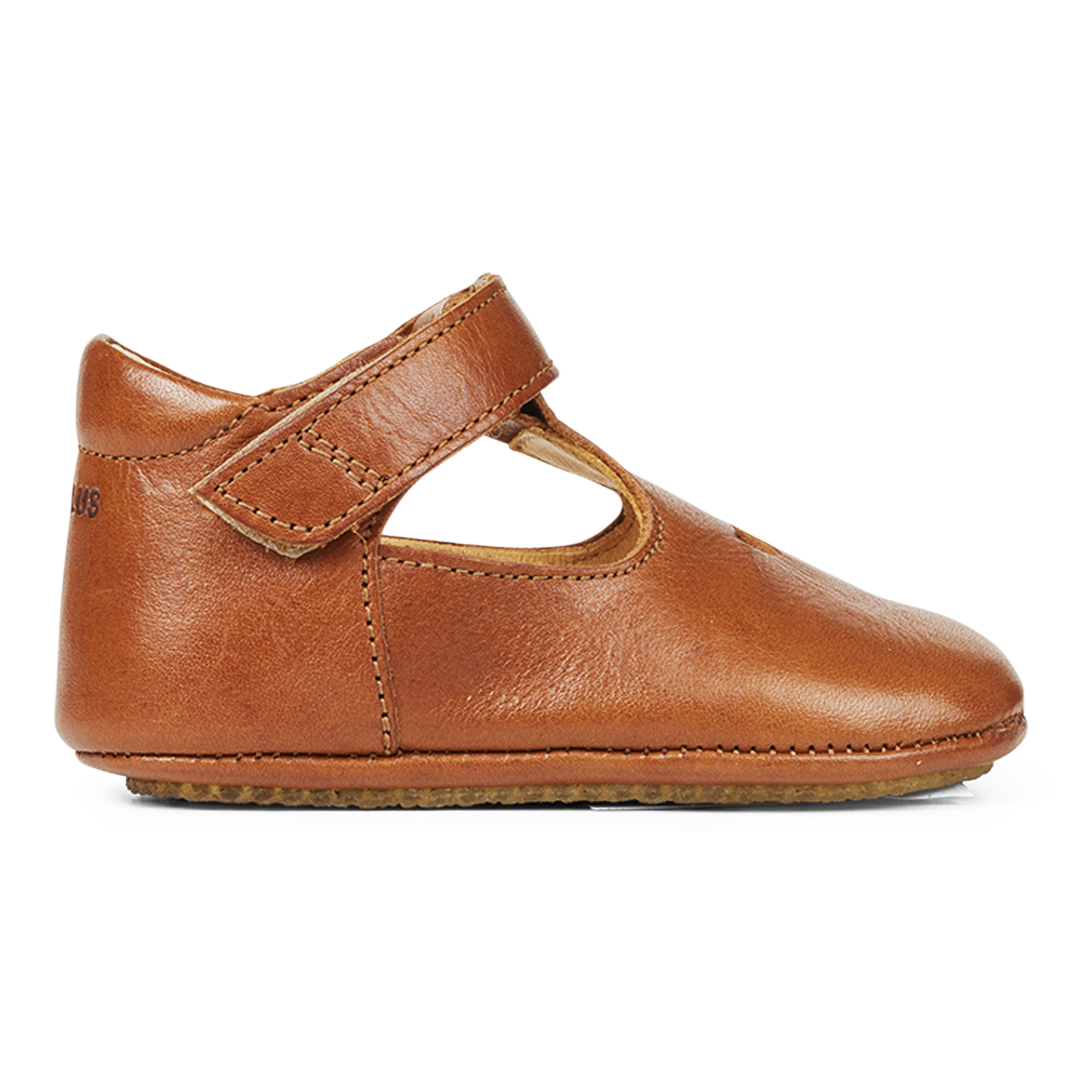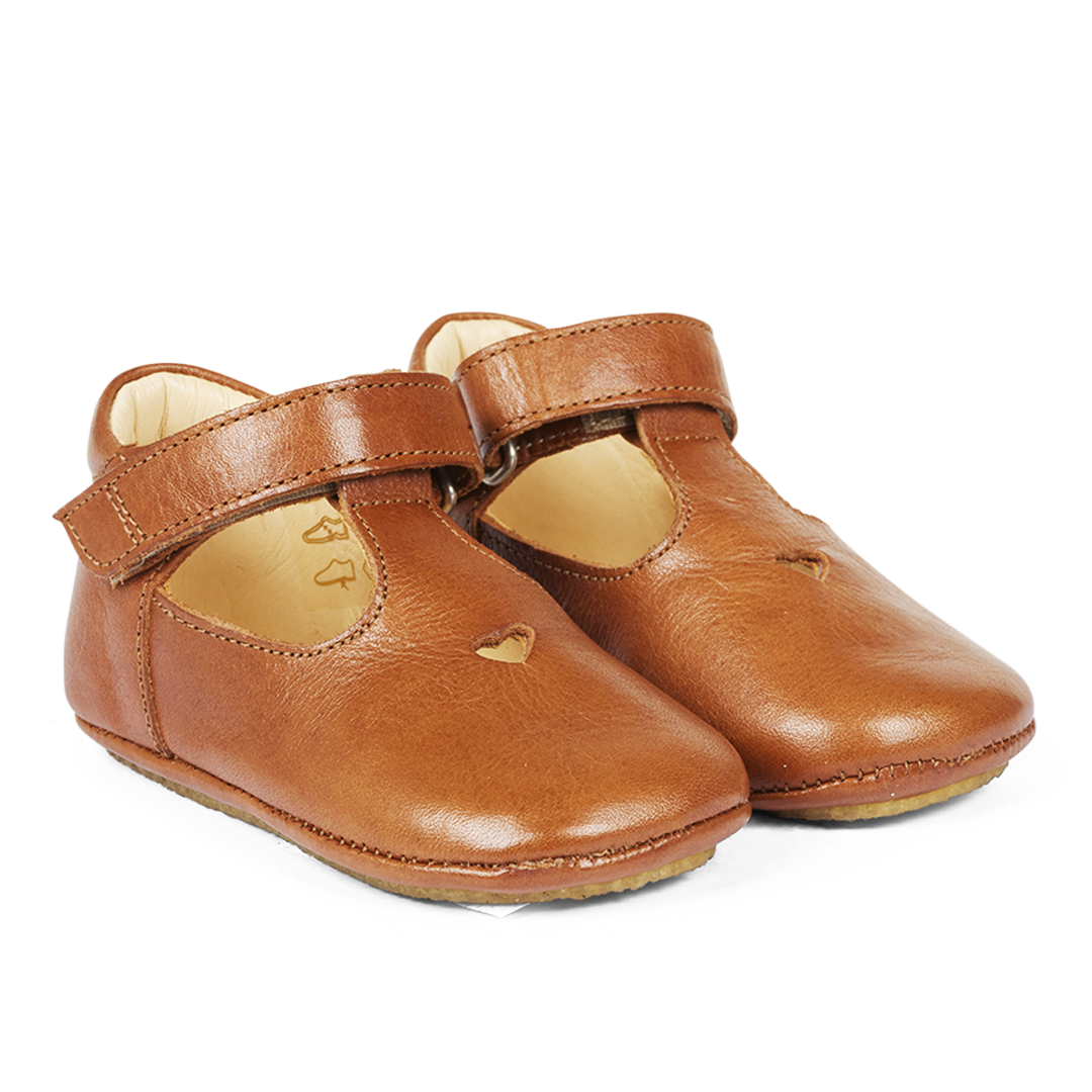Soft and flexible prewalker leather shoe with the distinctive cut-out heart motif on the front. The shoe features a thin, light and soft crepe rubber sole in renewable natural rubber carved for extra arch support. The shoe features an adjustable velcro strap and a fixed heel counter with a padded collar for extra comfort and support. Crafted in natural and breathable leather. Designed in Denmark and handmade with love in Portugal. Always measure your child's foot before buying to ensure you get the right size. We recommend a growth allowance of 1 cm.